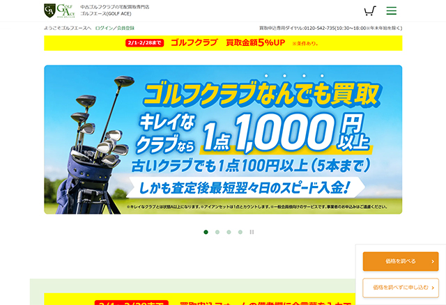 ゴルフエースは、大手ゲオグループの安心感があり、事前に「クイック査定」で目安を知りたい方におすすめです。10年以上前の古いクラブにも最低買取保証(条件あり)があり、値段がつかない場合でも無料で廃棄処分を依頼できます。