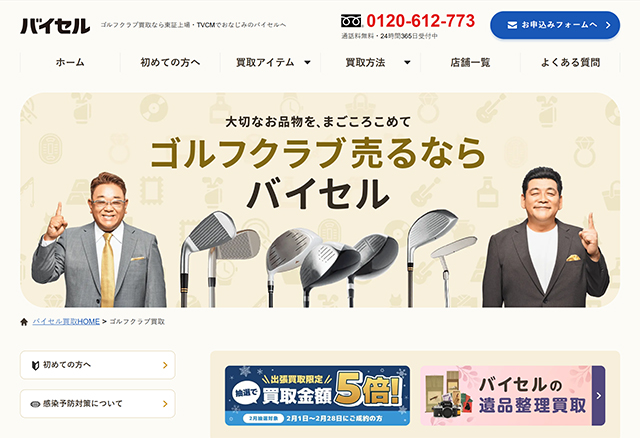 バイセルは、「対面で査定してほしい」「他にも売りたい不用品がたくさんある」という方に最適です。全国対応の出張買取があり、重いゴルフバッグを運ぶ手間がありません。また、東証上場企業としての信頼性も高い評価を得ています。